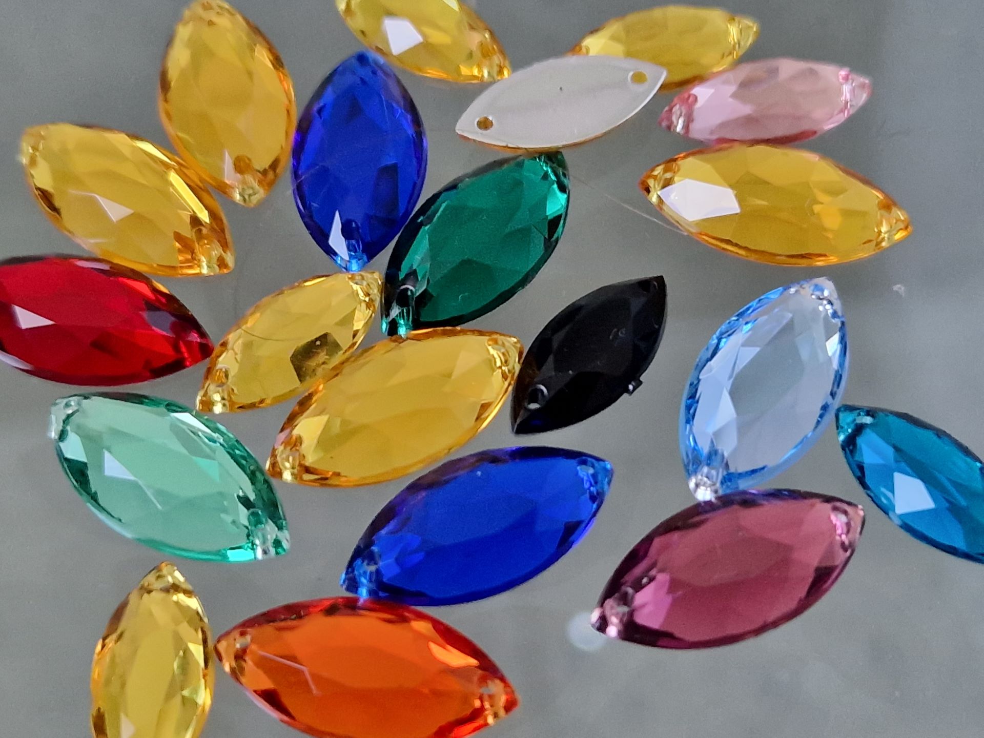 Strass acrilici, pietre sfaccettate e specchiate, con due fori per la cucitura, disponibili in due misure e ben 19 brillanti colori.
