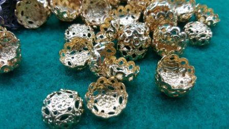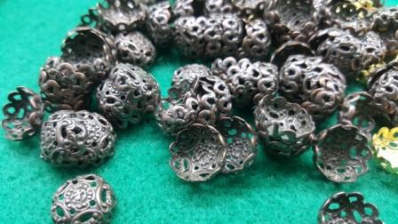 Coppette terminali in metallo traforato, con ampio foro alla base. Il disegno alterna trafori a soggetti in rilievo.